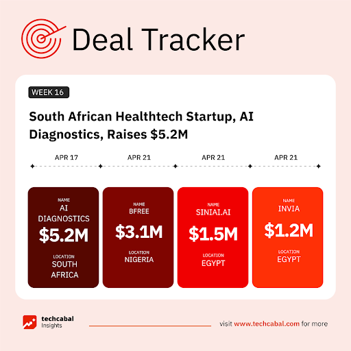 AI Diagnostics, a South African healthtech startup, raised 5.2 million in a funding round led by The Steele Foundation for Hope, with participation from the iFSP Group, Global Innovation Fund, and angel investors. (Apr 17)