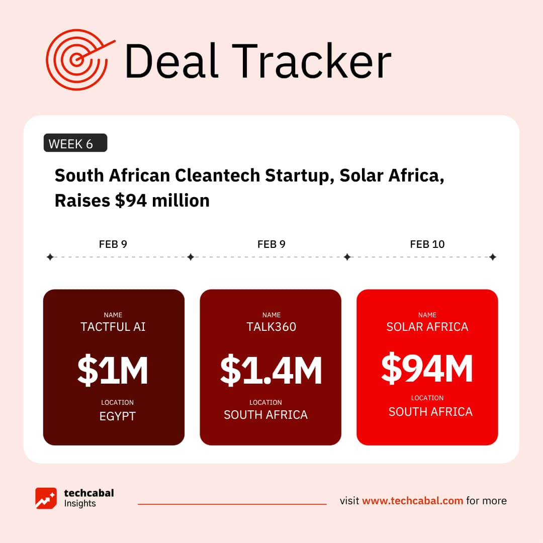 Solar Africa, a South African clean tech startup, secured $94 million in debt funding. The funding was led by Rand Merchant Bank and Investec. (Feb 10)