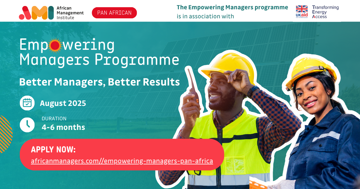 Beyond technical skills, energy companies need great leadership to thrive. 100s of firms like AFSIA, PowerGen & Solar Panda have lowered costs & grown revenue through AMIâs Empowering Managers Programme, supported by UK Aid. Join now from just $250.