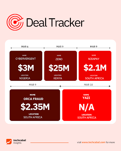 - Cybervergent, a Nigerian cybersecurity startup, raised $3 million in seed funding from Ventures Platform through its Pan-African Fund II and Atlantica Ventures. (Mar 6)