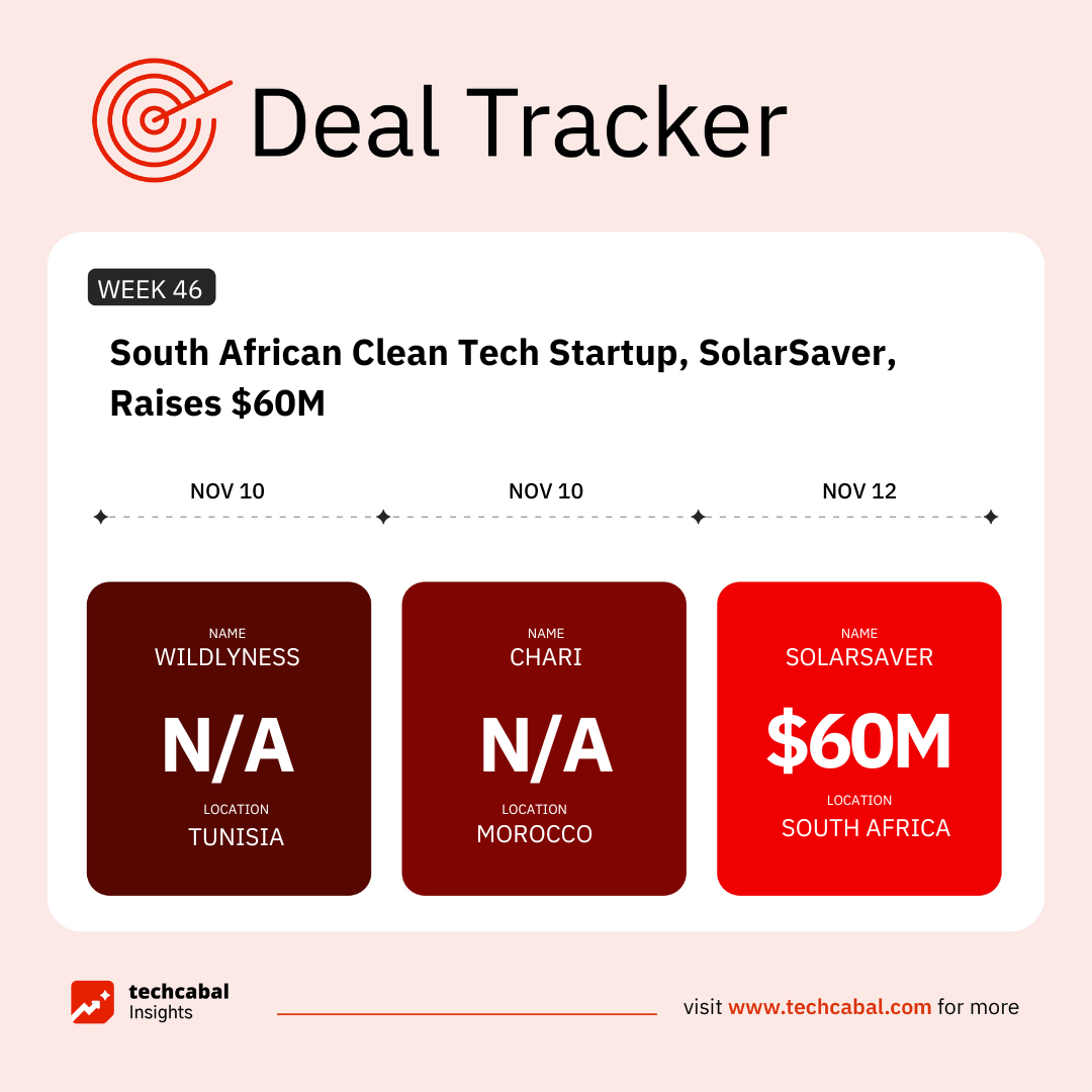 This week, SolarSaver, a South African cleantech startup, secured $60 million to expand access to solar power for small and medium-sized businesses in South Africa. The round was led by Inspired Evolutionâs Evolution III Fund, FMO, the Dutch development bank, and participation from Swedfund. (Nov 12)